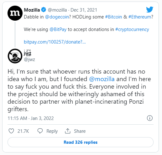 “Uno de nuestros pares en el espacio FOSS sin fines de lucro (Mozilla) está reevaluando su elección de aceptar donaciones de criptomonedas tras una considerable reacción violenta de sus seguidores, incluido su propio fundador, Jamie Zawinski”.