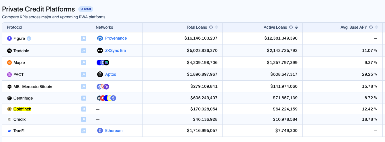 El crédito privado se está migrando cada vez más a on-chain. Protocolos como Figure dominan el panorama, representando la mayoría de los préstamos pendientes, mientras que nuevos participantes como Credix y Goldfinch también están expandiéndose.