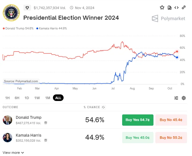 Notablemente, los apostadores cripto en la plataforma de predicción descentralizada Polymarket creen que el ex presidente tiene un 54,6% de posibilidades de ganar las próximas elecciones de noviembre.