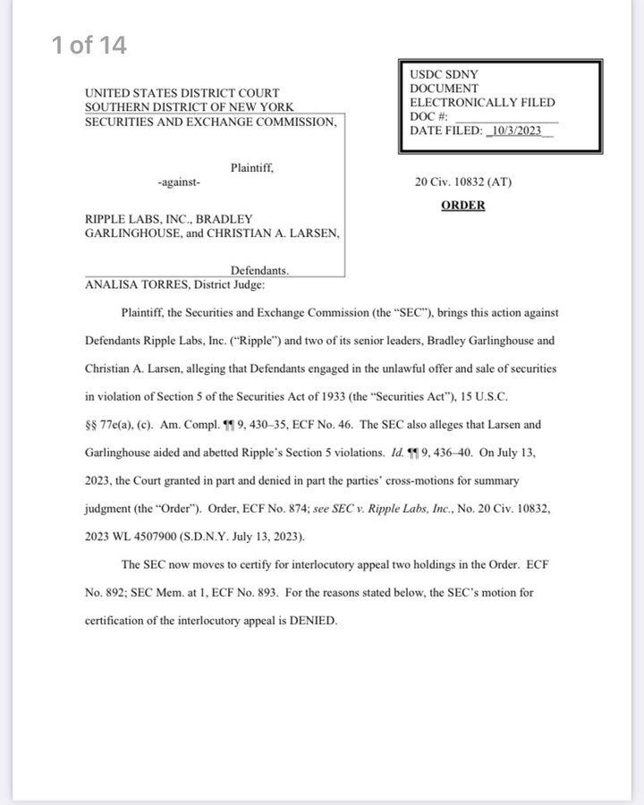 Durante la noche del martes 3 de octubre, se dio a conocer que la jueza Analisa Torres denegó la solicitud de apelación de la SEC en su batalla legal contra Ripple.