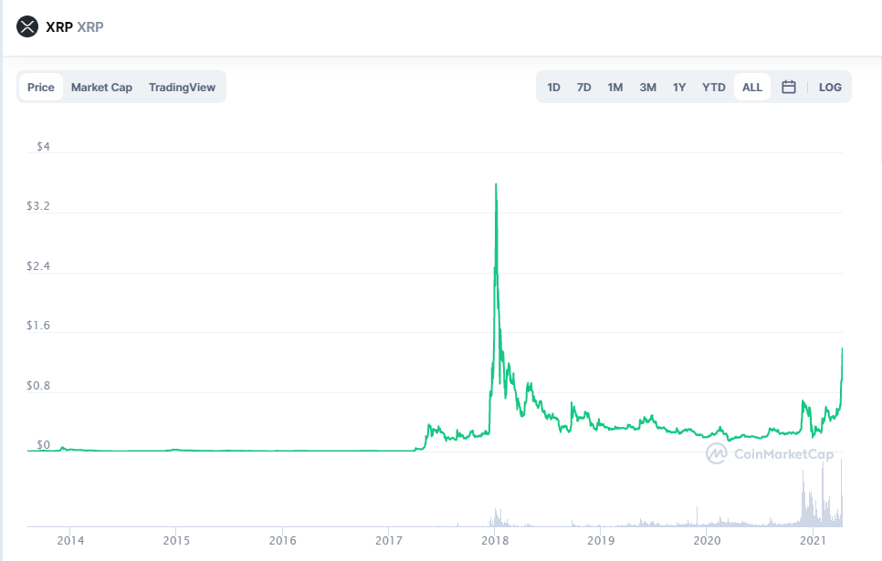 La criptomoneda XRP se negoció en casi 1,50 dólares durante la noche del sábado 10 de abril, lo que representa el precio más alto desde enero de 2018, según CoinMarketCap.