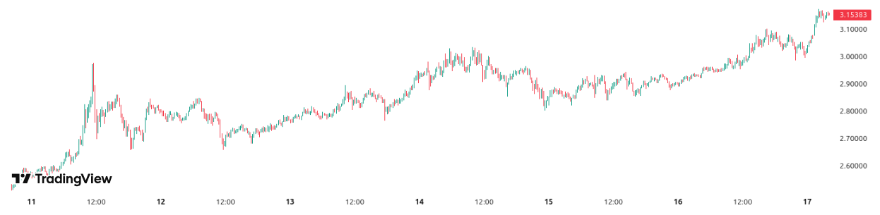 Al momento de la publicación, XRP cotiza en 3.16 dólares tras experimentar un aumento del 7.7% en las últimas 24 horas y del 30.5% en la última semana, según datos de BeInCrypto.