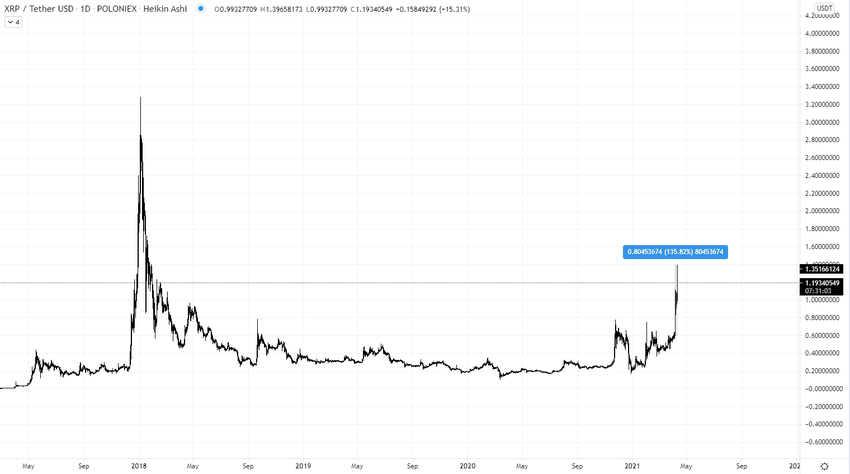 XRP vio su sexto día consecutivo de ganancias, ya que saltó un 40%. El precio de XRP subió de 1 dólar a 1,40 dólares a medida que el proyecto continúa saliendo de sus mínimos de varios años. La semana pasada, XRP subió más del 135%, enviando de esta forma a XRP al top 5 criptomonedas.