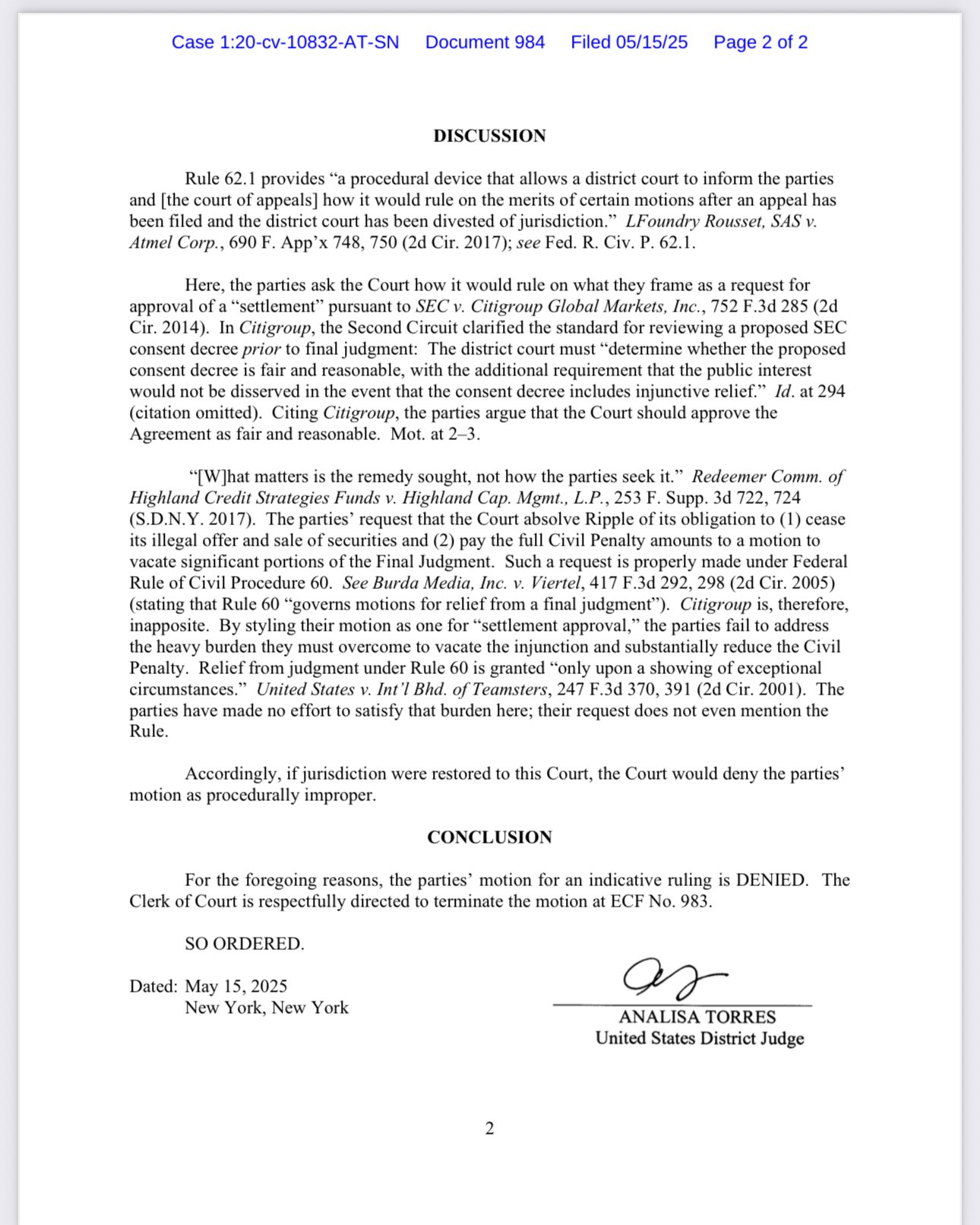 La jueza de distrito, Analisa Torres, rechazó la solicitud conjunta de ambas partes, quienes buscaban una resolución indicativa conforme al artículo 62.1 de la Regla Federal de Procedimiento Civil, una medida que podría haber disuelto parcialmente una sentencia en su contra y reducido la sanción económica.