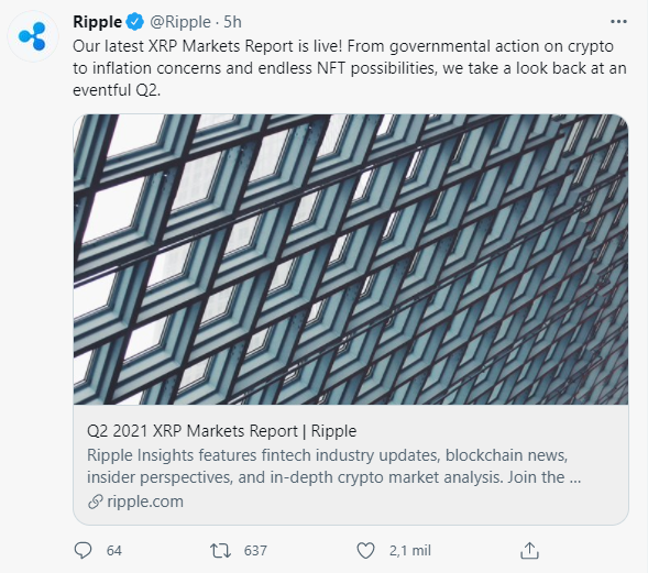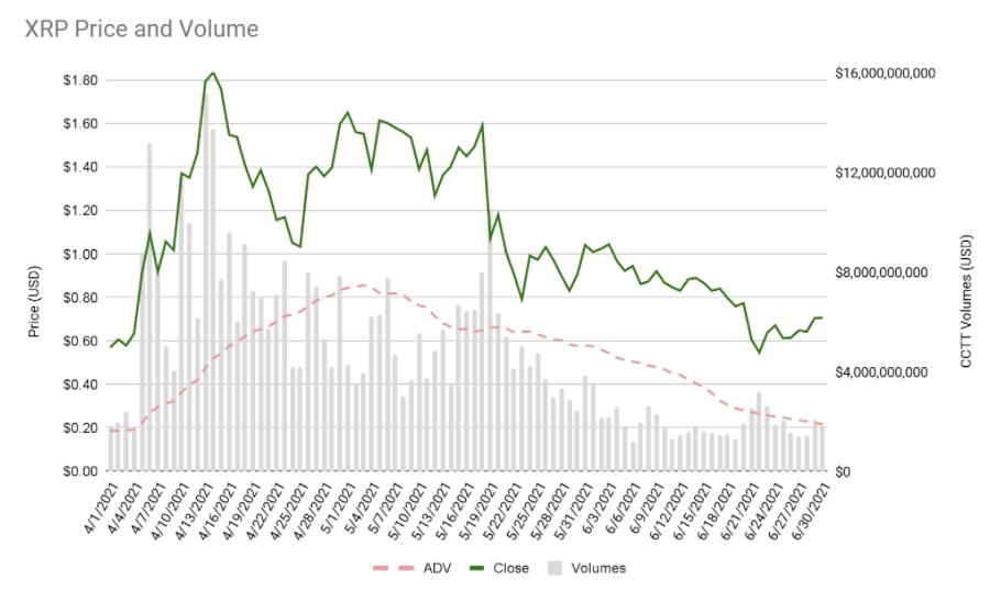 De acuerdo al informe de mercado publicado por Ripple en la tarde el jueves 29 de Julio, el volumen de trading diario de XRP durante el segundo trimestre de 2021 se duplicó a 4,49 mil millones de dólares.