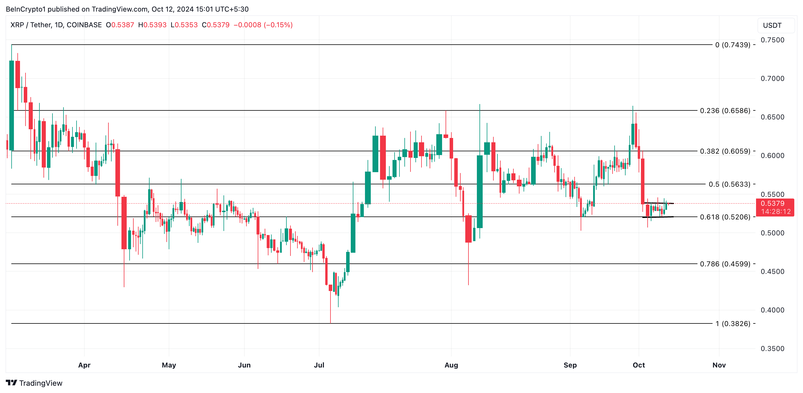 Ripple (XRP) se encuentra en un punto crucial, cotizando a 0.53 dólares, justo por encima de un nivel de soporte clave en 0.52 dólares. Si el precio cae por debajo de este umbral, podría resultar en una fuerte caída de hasta el 27%.