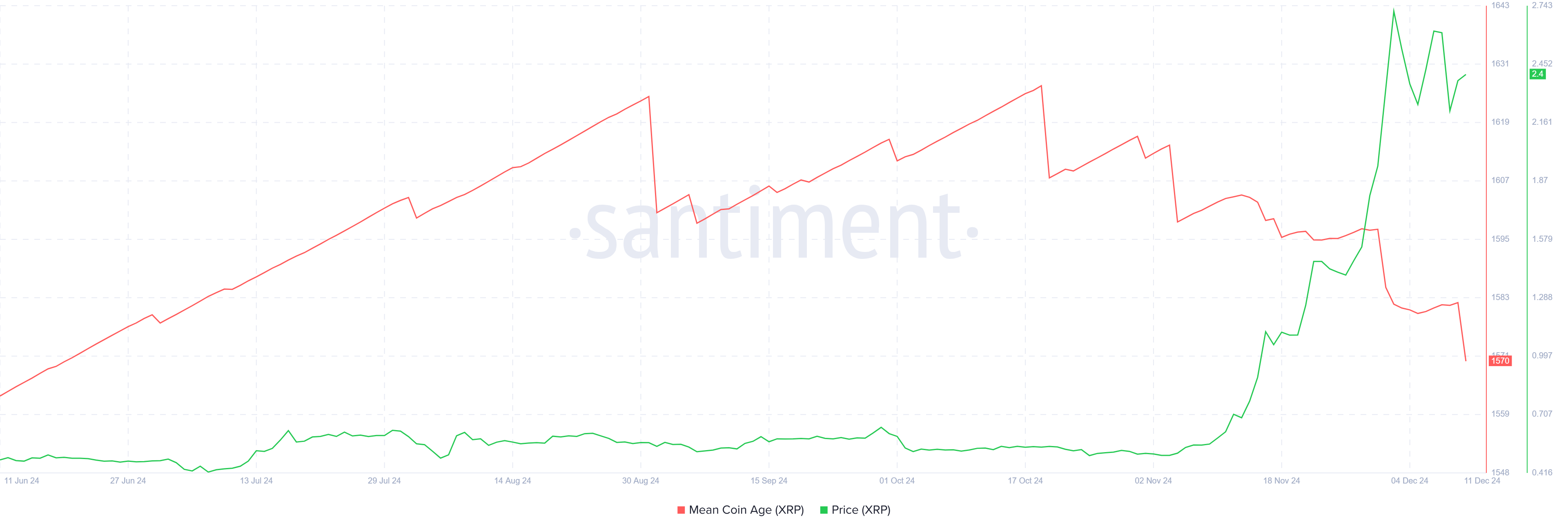 Esta medida rastrea la edad promedio de los tokens en circulación, y su disminución sugiere que los holders a largo plazo están perdiendo interés en mantener XRP.
