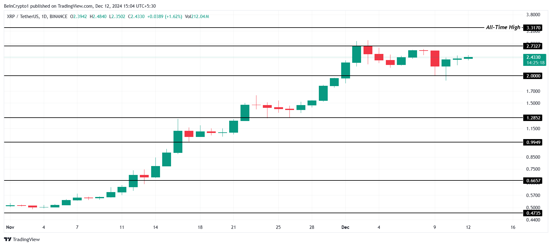 El precio actual de XRP de 2.43 dólares enfrenta resistencia en la marca de 2.73 dólares, un nivel crítico que se interpone entre la altcoin y un nuevo máximo histórico (ATH) por encima de 3.31 dólares.