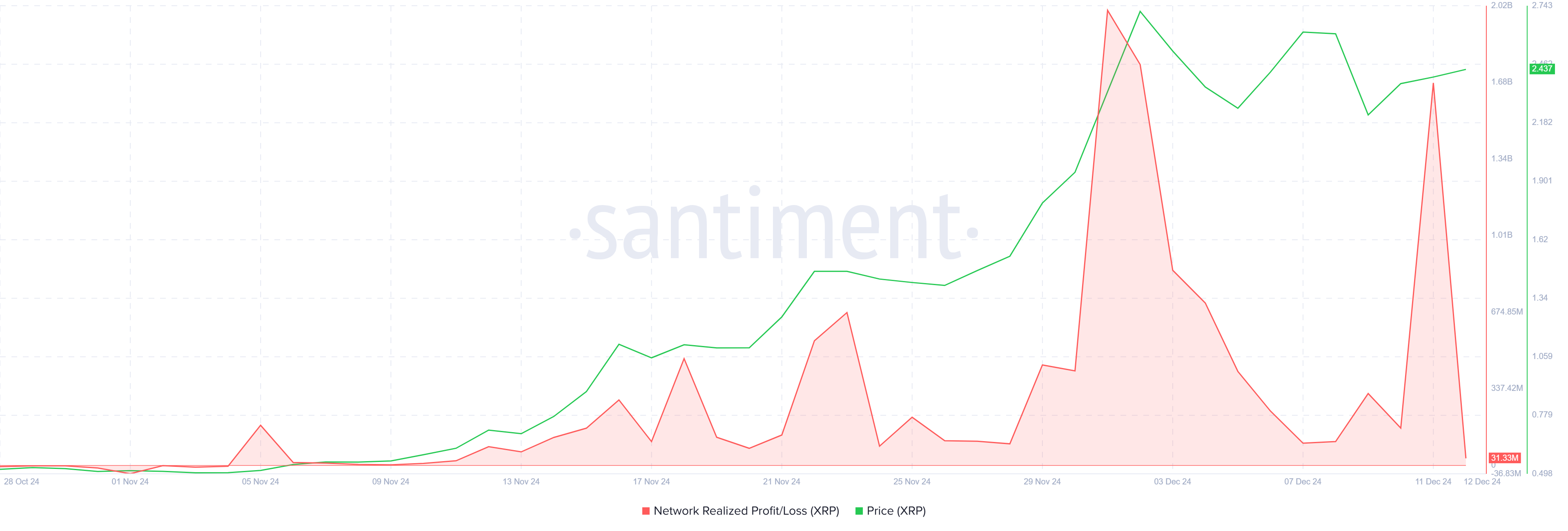La toma de ganancias se ha intensificado ya que el precio de XRP no logra superar la resistencia en 2.73 dólares, con muchos inversores optando por cobrar las ganancias recientes. Este comportamiento es evidente en el aumento de las ganancias realizadas, un indicador clave de la presión de venta.