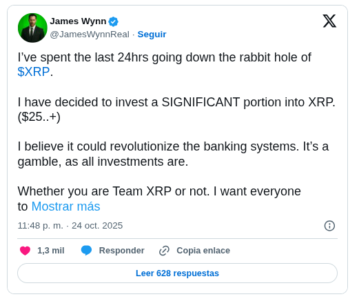 Al mismo tiempo, James Wynn, ballena reconocida en el entorno cripto, reafirmó su confianza e inversión en el token de Ripple.