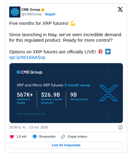 SponsoredAdemás, los futuros de XRP en CME Group han generado cerca de 27 mil millones de dólares en volumen, evidenciando demanda de cobertura tanto de instituciones como de operadores activos.