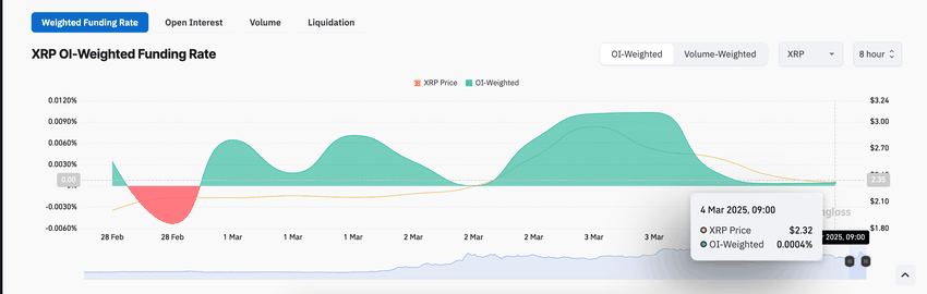 Además, a pesar de la caída del precio de XRP desde el máximo del domingo, su tasa de financiación sigue siendo positiva, lo que pone de relieve el optimismo entre los participantes de su mercado de futuros. En el momento de la publicación, se encuentra en el 0,0004%.