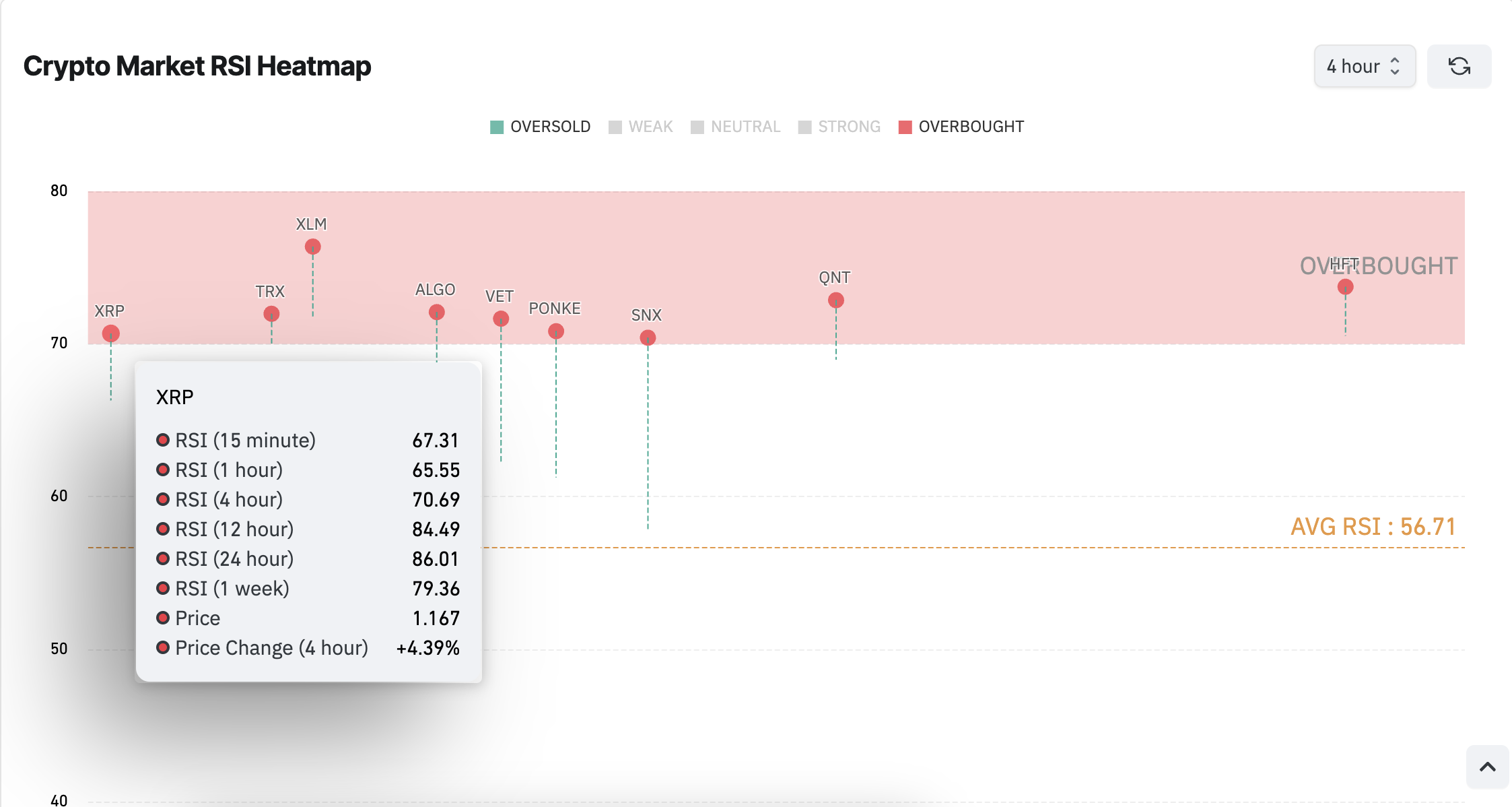 Las condiciones de sobrecompra de XRP en múltiples marcos de tiempo apuntan a una conclusión clara: el mercado está sobrecalentado. Están emergiendo señales de agotamiento de los compradores, aumentando la probabilidad de un descenso sostenido en el precio del cripto XRP.