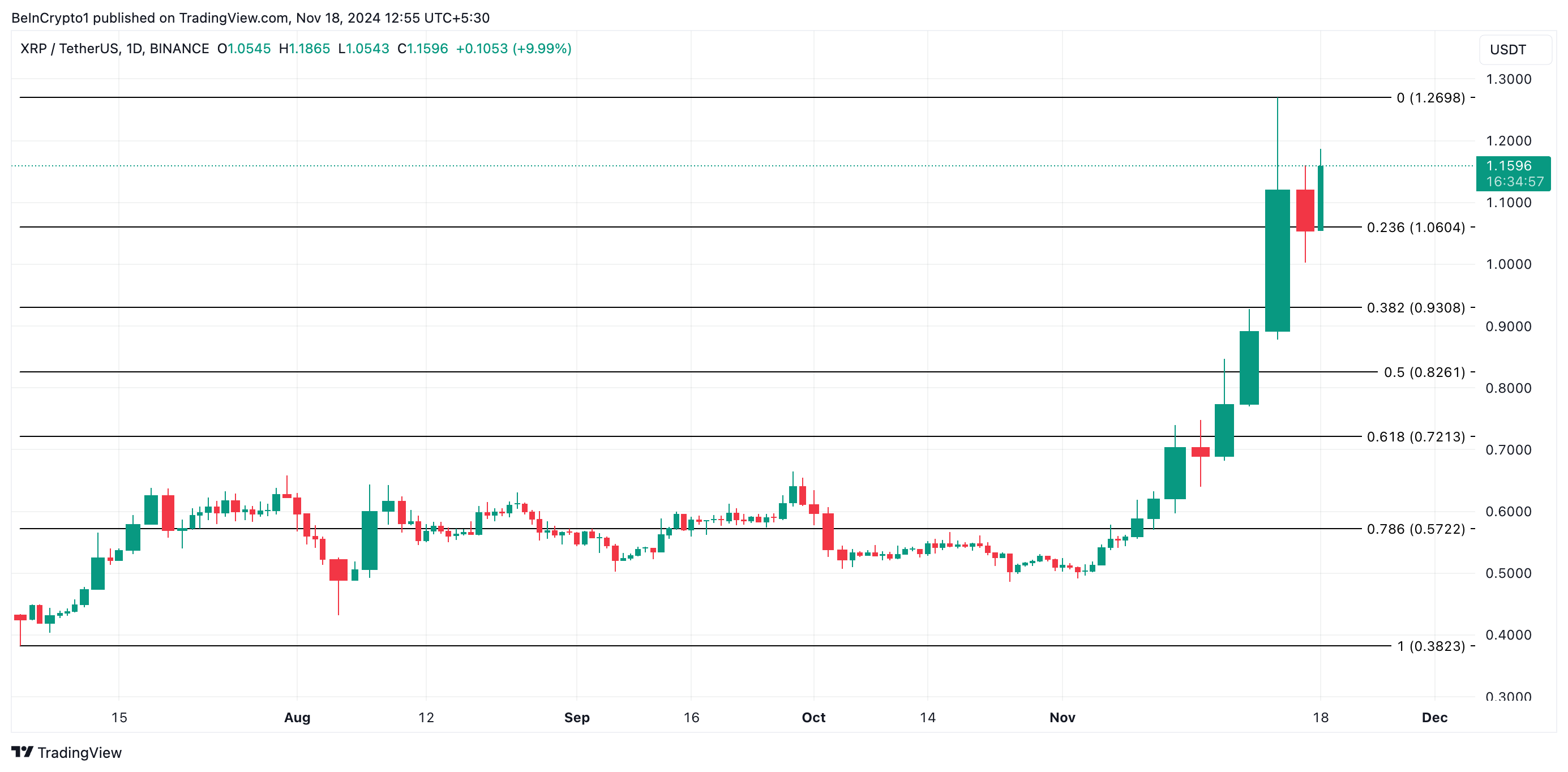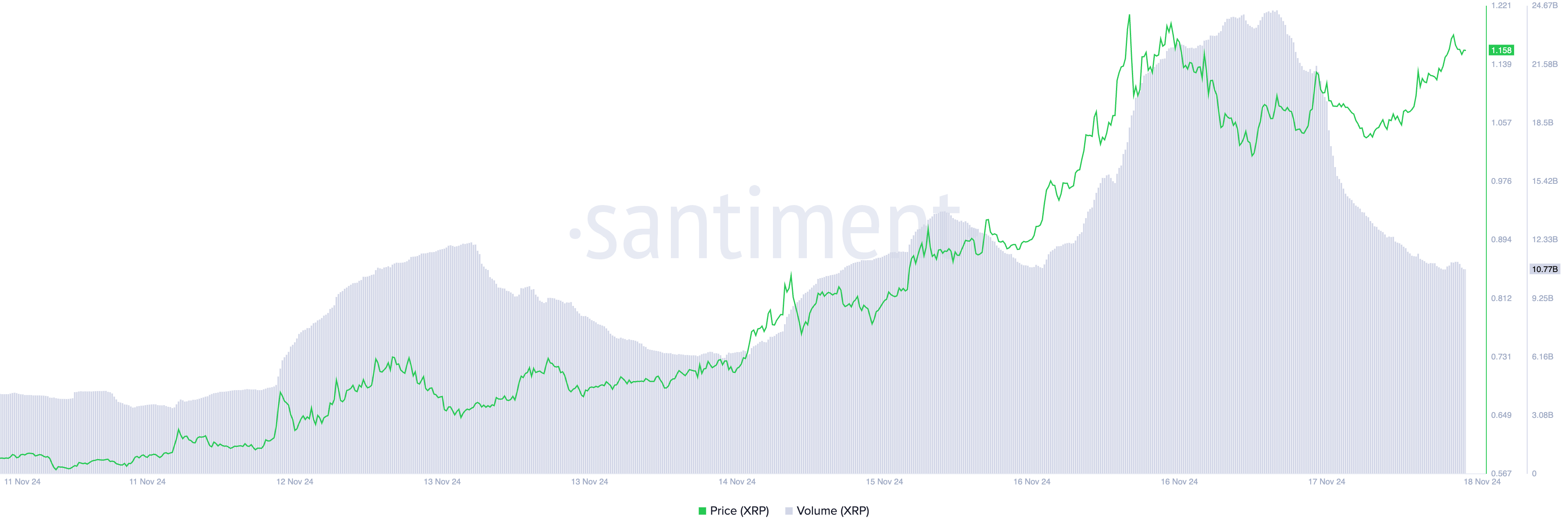 El XRP de Ripple alcanzó un máximo de tres años de 1.26 dólares el 16 de noviembre, pero desde entonces ha retrocedido a 1.15 dólares, reflejando un descenso del 9% en los últimos dos días.