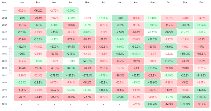 XRP es el token nativo del XRP Ledger, una red blockchain enfocada en pagos transfronterizos rápidos y de bajo costo. Históricamente, abril ha sido su mes más fuerte con un retorno promedio del 24.8% desde 2014, aunque la mediana ronda apenas el 2%.