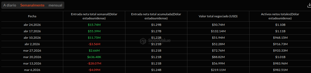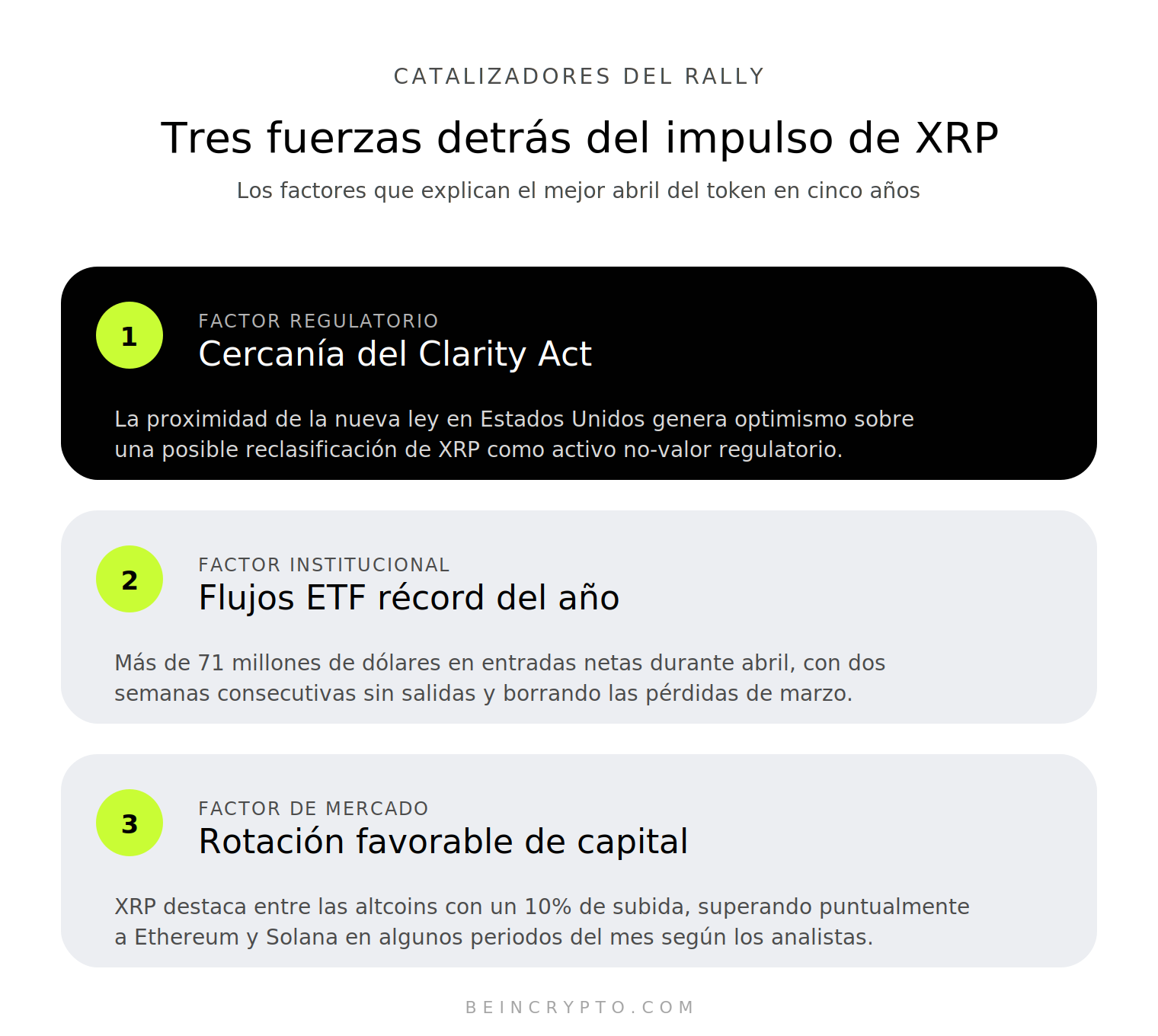 El segundo factor son los ETF de XRP. Estos fondos cotizados acumularon más de 80 millones de dólares en entradas netas durante abril, su mejor racha del año con tres semanas consecutivas sin salidas netas.