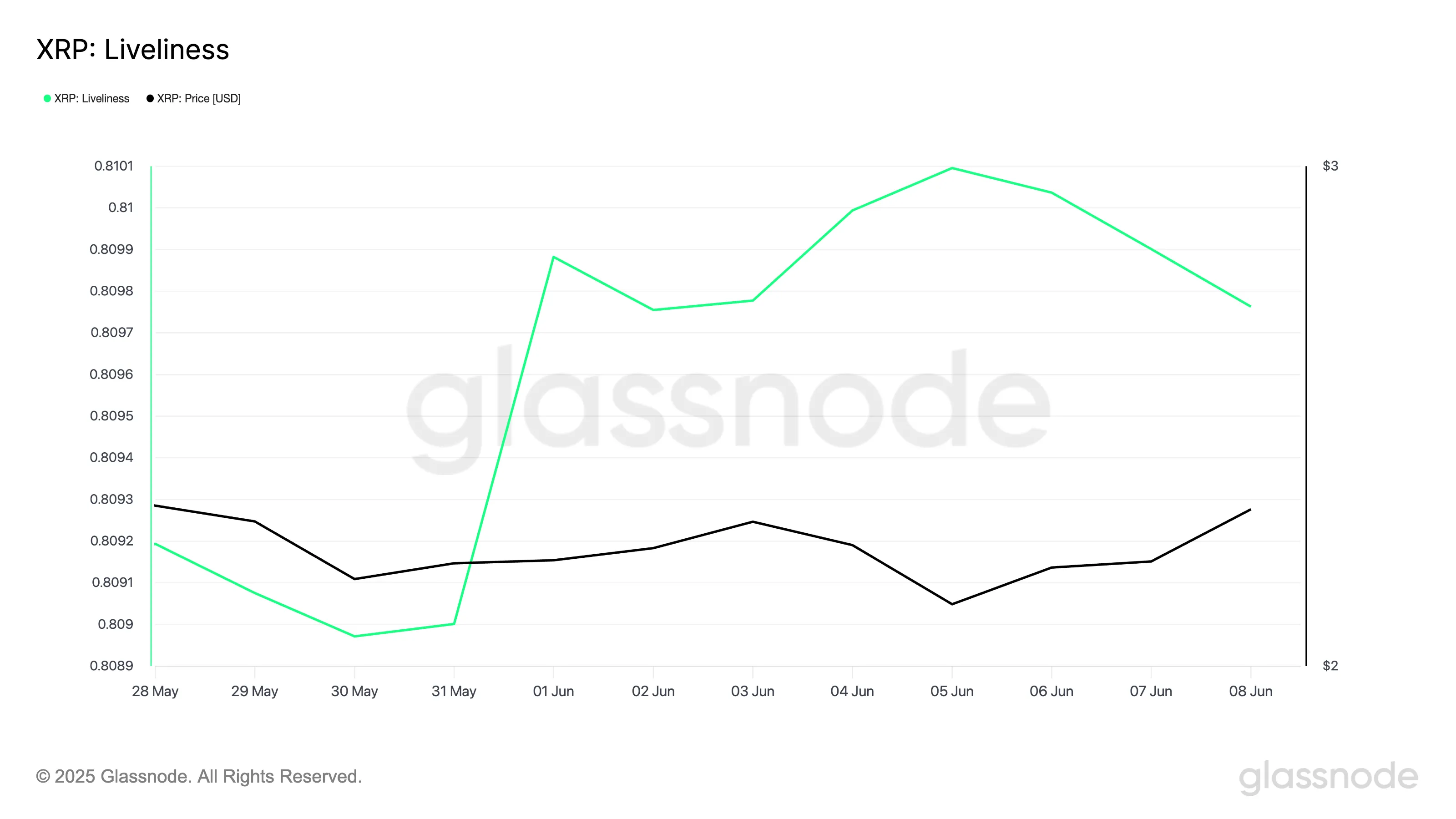 Según datos de Glassnode, la vitalidad de XRP ha disminuido constantemente desde el 5 de junio, cayendo un 1% para alcanzar 0,809 al 8 de junio, lo que indica una actividad reducida entre los STH. La vitalidad rastrea el movimiento de tokens mantenidos a largo plazo/dormidos.