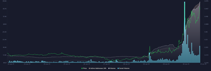 Durante la semana, el máximo visto en XRP está muy por encima de los registros anteriores. Los registros de volumen social del 30 de enero de 2021 muestran que el nivel de participación de Ripple llegó a 1.350 menciones en el máximo del frenesí.