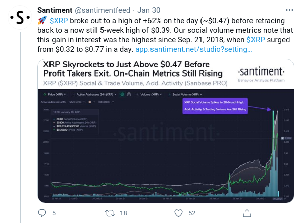 Las estadísticas de Santiment, un agregador de datos, revelan que el aumento de precios observado con XRP coincide con numerosas interacciones en las redes sociales, a niveles que no se veían desde 2018.