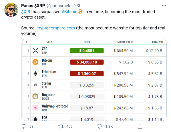 La tracción observada en las plataformas de redes sociales ha registrado nuevos máximos a medida que el volumen de trading de XRP supera al mercado de Bitcoin.