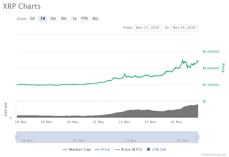 La criptomoneda llegó a $0.30 ese día y llegó a $0.42 el sábado (21). El domingo (22), el XRP alcanzó los 0,46 dólares y en la mañana del del lunes, alcanzaba los 0,48 dólares. Actualmente, al escribir este artículo, el precio ronda los 0,72 dólares, una subida impactante al que toda la comunidad cripto observa con palomitas en mano.