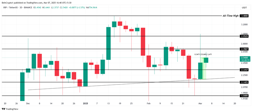 El precio de XRP se sitúa actualmente en 2,54 dólares tras un aumento del 15% esta semana. La altcoin está intentando asegurar el soporte de 2,33 dólares, lo que podría allanar el camino para una mayor subida. Si este nivel se mantiene, XRP podría apuntar a 2,70 dólares en un futuro próximo.