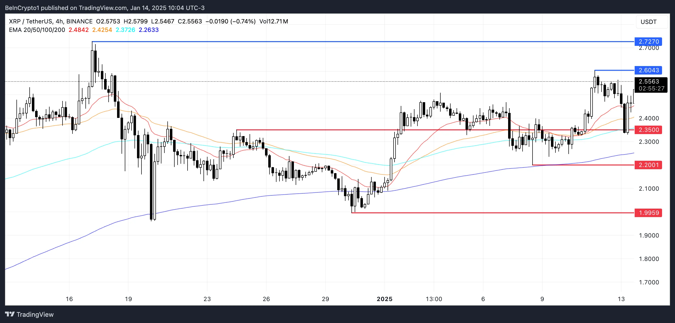Las líneas EMA de XRP están actualmente en una configuración alcista, con EMAs a corto plazo posicionadas por encima de las de largo plazo. Esta alineación sugiere un fuerte momentum alcista, y si se prueba y rompe la resistencia en 2,6 dólares, podría abrir el camino para mayores ganancias.