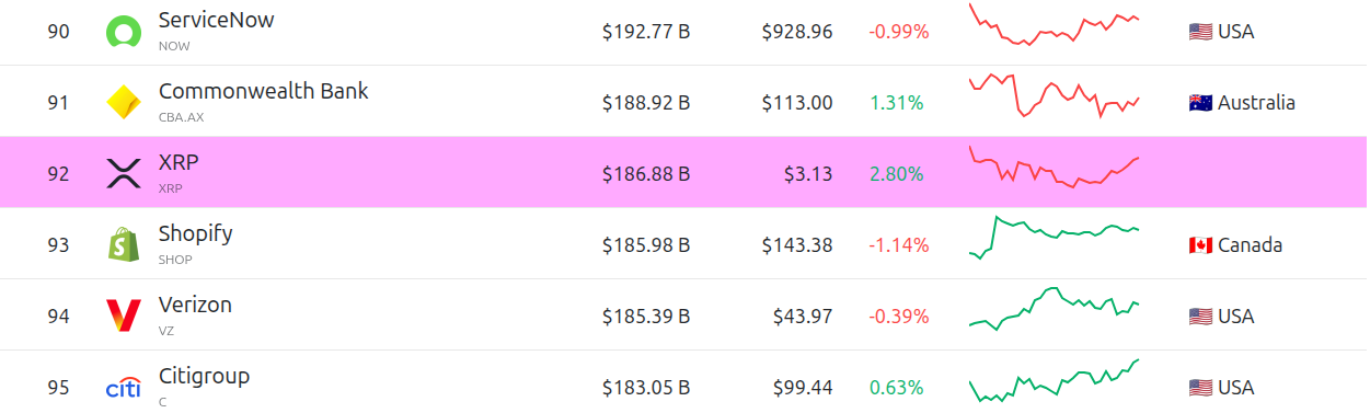 Actualmente, XRP cotiza cerca de 2.95 dólares con una capitalización de mercado de 186,88 mil millones de dólares. Gracias al reciente rally, XRP ocupa la posición número 92 entre los activos más valiosos del mundo, superando a Shopify, Verizon y Citi.
