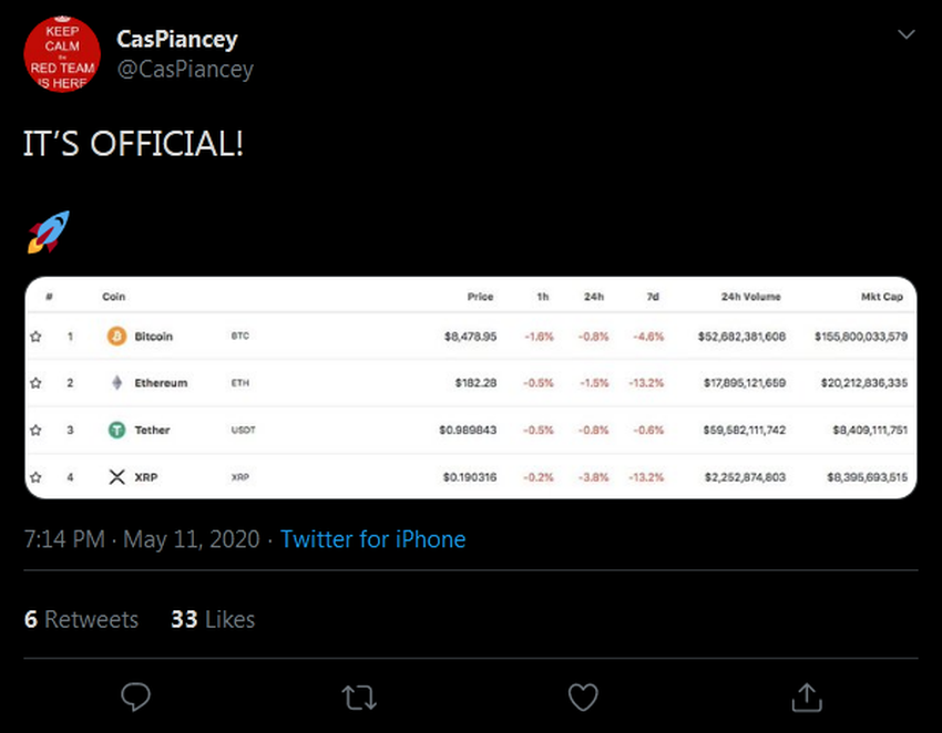 Durante un breve período el martes, USDT robó a XRP el tercer puesto en el ranking de capitalización del mercado de criptomonedas. Al momento de escribir este artículo, XRP ha recuperado el tercer puesto con una ventaja de 141 millones de dólares en la capitalización del mercado.
