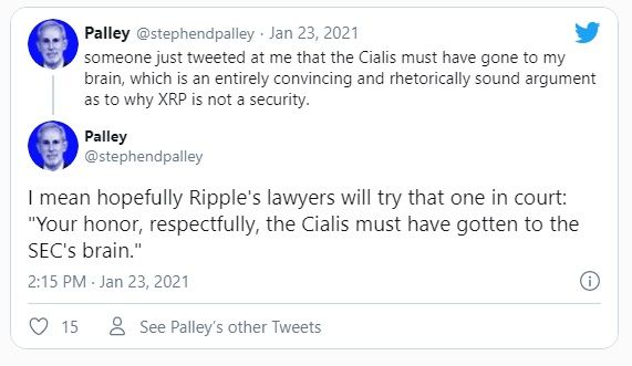 En su opinión, que ha compartido antes en Twitter, Palley cree que el token XRP es un valor. Esto es a pesar de que un usuario de Twitter afirmó que el medicamento para la disfunción eréctil Cialis se le había subido a la cabeza.