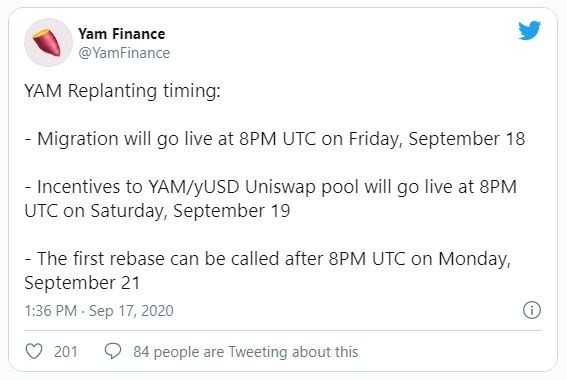 Yam Finance está ahora a punto de lanzar su iteración v3 y migrar tokens v2 a los nuevos contratos. Esto ocurrirá hoy, 18 de septiembre, a las 20.00 UTC según el último tweet del equipo: