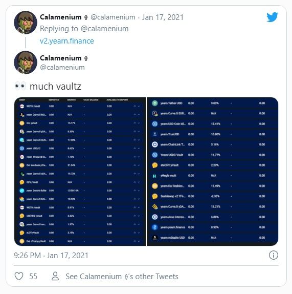 El entusiasta de DeFi y Ethereum “Calamenium” publicó una instantánea de algunos de las nuevos Vaults:
