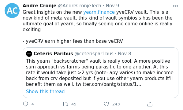 “El uso óptimo de Curve sigue siendo la estrategia de agricultura de rendimiento clave para varios pools en la actualidad. Yearn necesita un pool enorme y creciente de veCRV bloqueado para respaldar altos rendimientos en múltiples vaults a medida que aumentan los depósitos de stablecoins y Bitcoin”.