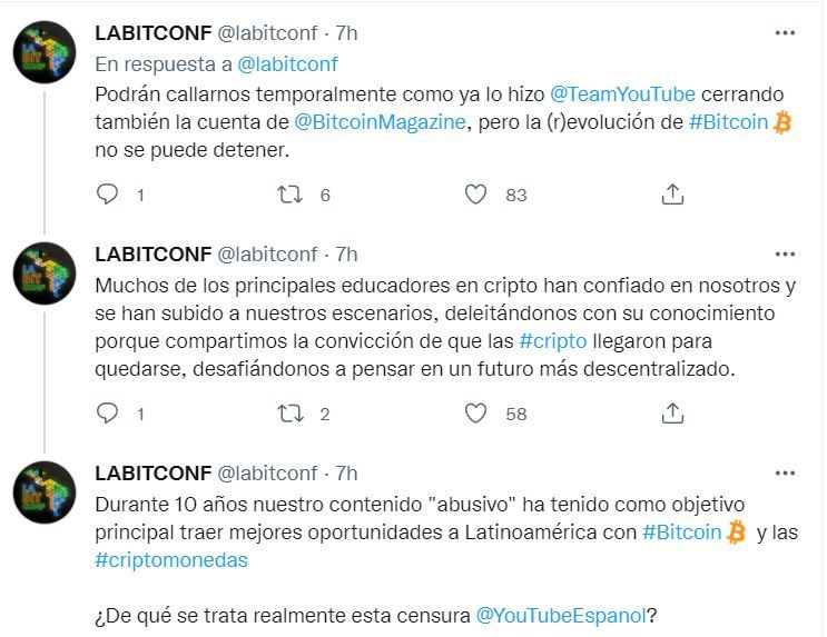 “¡Alguien está intentando silenciar a #Bitcoin! Nuestro canal de YouTube de LABITCONF fue cerrado y las apelaciones aún no han sido respondidas. Por favor @youtubespanol detengan esta absurda censura y concéntrense en las estafas reales desatendidas en su plataforma”.