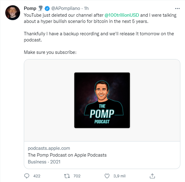 Horas después de la denuncia, Pomp confirmó que se había reestablecido el acceso a su canal “sin ninguna explicación”: