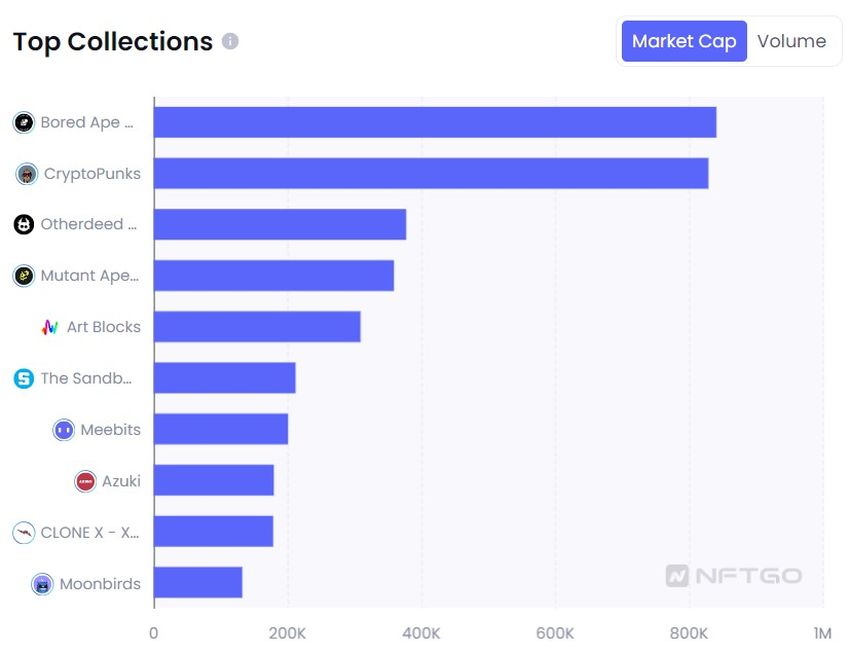 SponsoredEn los últimos siete días, BAYC (8.17%), CryptoPunks (8.05%), Otherdeeds (3.66%) y MAYC (3.49%) fueron los cuatro NFT principales por capitalización de mercado en NFTGo.