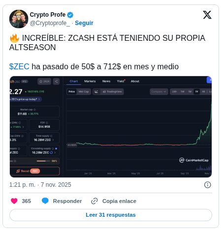En X (antes Twitter), analistas destacan la magnitud del movimiento. La publicación de Crypto Profe refleja el entusiasmo del mercado y sugiere un fuerte interés especulativo en Zcash. Estas manifestaciones enfatizan el protagonismo de la altcoin dentro de la muy esperada altseason.