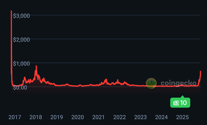 El precio de Zcash (ZEC) se disparó de 50 dólares a casi 750 dólares en casi mes y medio, logrando un aumento explosivo del 1,400%. Este impulso reavivó el interés del mercado, consolidando a ZEC como referente del auge de altcoins con foco en privacidad. Es la primera vez que ZEC alcanza está marca en casi 8 años.