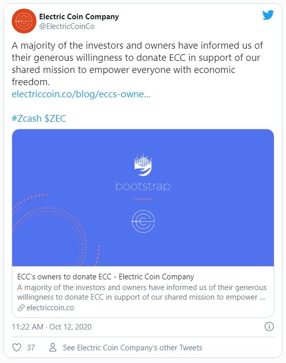 El cambio de propiedad de ECC se anunció a través de una publicación de blog el 12 de octubre. La publicación afirma que la mayoría de los propietarios de Electric Coin Company acordaron donar la empresa a Bootstrap.